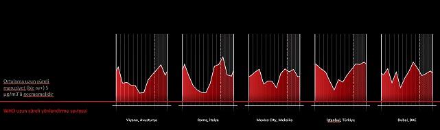 - İstanbul'un iç hava kalitesi: Tüm ülkelerin aylık ortalama iç mekan PM2.5 seviyesi, yılın en az 6 ayı boyunca DSÖ (Dünya Sağlık Örgütü) maruziyet kılavuzunun uzun vadeli seviyesini aştığı tespit edildi. Ulusal ortalama veriler, Aralık ayında DSÖ kılavuzunun 5,5 katına ulaşırken; İstanbul iç hava kalitesinin, Şubat ayında DSÖ ortalamasının 5 katına ulaşıyor. Aralık, Ocak ve Mart aylarında ise neredeyse 5 katına çıkıyor.
