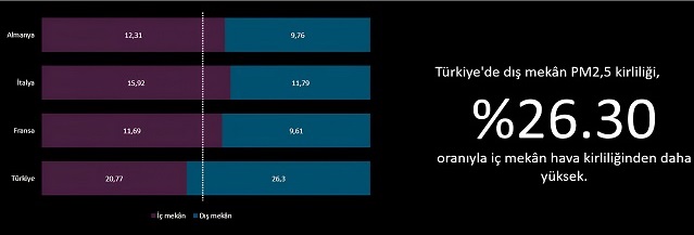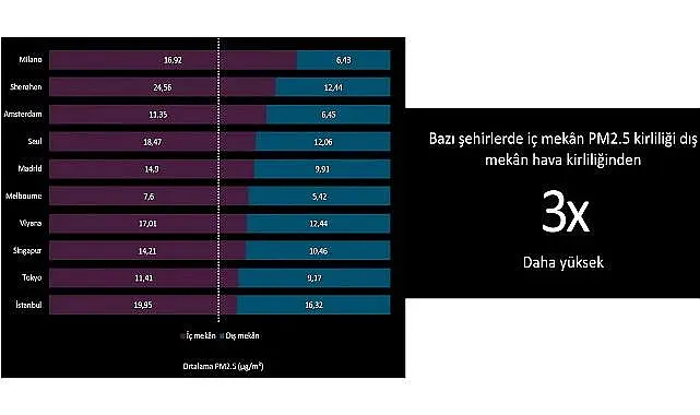 P.M2.5 değerleri incelendiğinde, çoğu ülkede iç mekân hava kirliliğinin dış mekân hava kirliliğinden daha yüksek olduğu görülüyor. Türkiye'de genel olarak iç mekân hava kirliliği dış mekân hava kirliliğinden daha düşükken, araştırma sonuçlarına göre bir metropol olan İstanbul'da tam tersi bir durum söz konusu ve iç mekân havası dış mekân havasından daha kirli. İstanbul, araştırmadaki şehirler arasında en yüksek P.M2.5 değerlerine sahip 10. şehir olarak sıralanıyor.