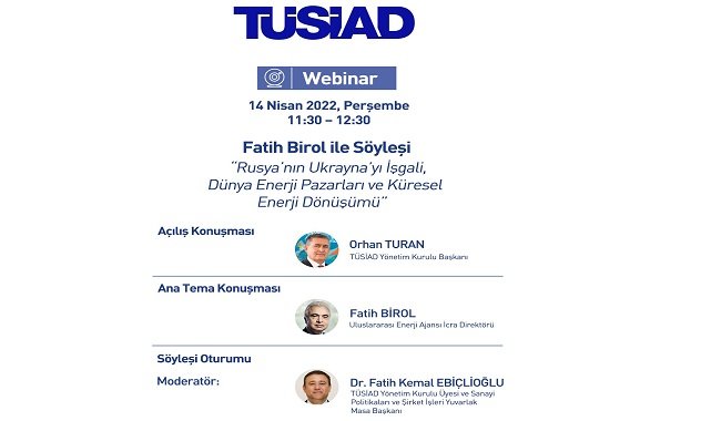 TÜSİAD, Uluslararası Enerji Ajansı Başkanı Dr. Fatih Birol ile Söyleşi düzenliyor. Söyleşinin konusu, ''Rusya’nın Ukrayna’yı İşgali, Dünya Enerji Pazarları ve Küresel Enerji Dönüşümü''. TÜSİAD söyleşisi, youtube kanalından yayınlanacak.