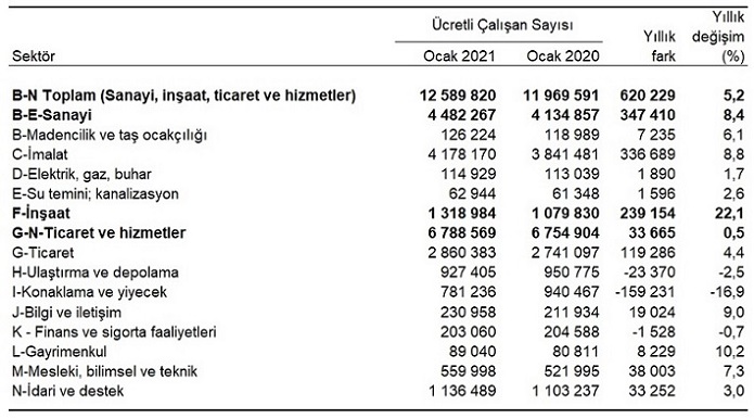 Sanayi, inşaat ve ticaret-hizmet sektörleri toplamında ücretli çalışan sayısı 2021 Ocak ayında bir önceki yılın aynı ayına göre %5,2 arttı. Ücretli çalışan sayısı bir önceki yılın aynı ayında 11 milyon 969 bin 591 kişi iken, 2021 yılı Ocak ayında 12 milyon 589 bin 820 kişi oldu.