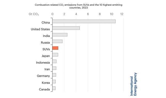 Uluslararası Enerji Ajansı (IEA), SUV araçlarla ilgili lginç bir paylaşım yaptı. SUV'lerin oluşturduğu çevre kirliliğine vurgu yapan IEA'nın yorumu: SUV'ler bir ülke olsaydı, dünyanın en büyük 5. CO2 yayıcısı olurlardı.'' IEA, ''SUV araçlar ve emisyonları'' konulu birde grafik yayınladı.