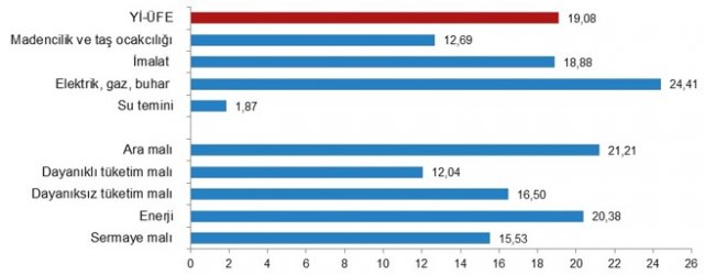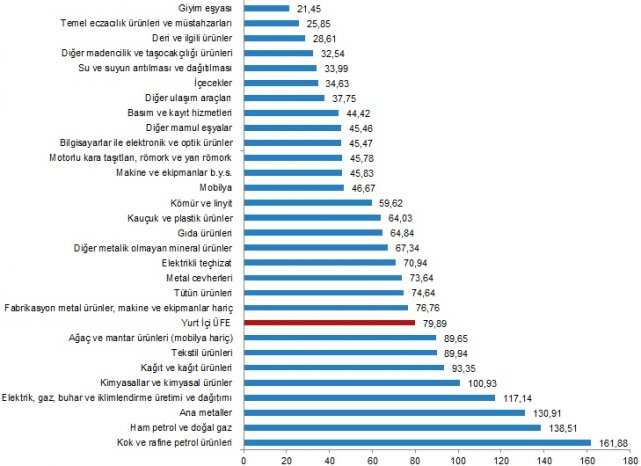 Yıllık en düşük artış; %21,45 ile giyim eşyası, %25,85 ile temel eczacılık ürünleri ve müstahzarları, %28,61 ile deri ve ilgili ürünler alt sektörlerinde gerçekleşti. Buna karşılık kok ve rafine petrol ürünleri %161,88, ham petrol ve doğal gaz %138,51, ana metaller %130,91 ile endekslerin en fazla arttığı alt sektörler oldu.Sektörlere göre Yİ-ÜFE yıllık değişim oranları (%), Aralık 2021