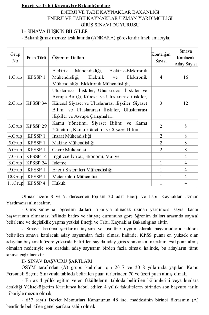 Enerji ve Tabi Kaynaklar Bakanlığı (ETKB), Ankara’da Uzman Yardımcılığı sınavı açtı. Elektrik, İnşaat, Çevre, Elektrik-Elektronik, gübi mhendislikle dahil uzman yardımcılığı sınavı için ayrıntılar aşağıda okunabilir.
