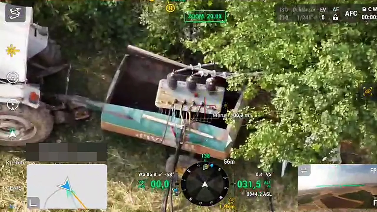 Dicle Elektrik ekiplerinin dron ile tespit ettiği kaçak trafonun, bir traktöre bağlı römork üzerindeki tekerlekli su tankeri içine gizlendiği ortaya çıktı. Yerden bakıldığında sıradan bir su tankeri gibi görünen bu düzenek, detaylı dron görüntüleriyle bulundu. Yapılan teknik incelemede, söz konusu trafonun 430 hanenin elektrik ihtiyacını karşılayacak kapasitede olduğu belirlendi.