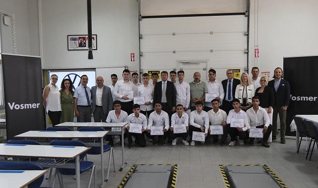 Eğitimlerini başarıyla tamamlayan 20 öğrenci Doğuş Otomotiv Başarı Sertifikası’nın sahibi oldu. Öğrenciler sertifikalarını Doğuş Otomotiv İnsan Kaynakları Yöneticisi Doğan Kumsar, Vosmer İnsan Kaynakları ve Kurumsal Hizmetler Müdürü Burcu Erüstün, Bornova Satış Sonrası Hizmetler Müdürü Ozan Gürol, Gaziemir Servis Müdürü Vedat Tiğilsel, İnsan Kaynakları ve İş Hizmetleri Şefi Hilal Yılmaz, Konak İlçe Milli Eğitim Müdürü Serdal Şimşek ve okul müdürü Adnan Yıldırım tarafından teslim aldı.