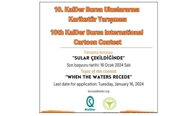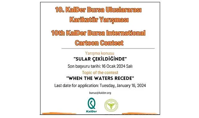 KalDer Bursa (Türkiye Kalite Derneği Bursa Şubesi), bilgi paylaşımı yaptı: ''10. KalDer Bursa Uluslararası Karikatür Yarışması Başvuruları İçin Son Hafta ‘Sular Çekildiğinde’ konu başlığı ile duyurduğumuz yarışmamıza başvurular 16 Ocak’ta sona eriyor.