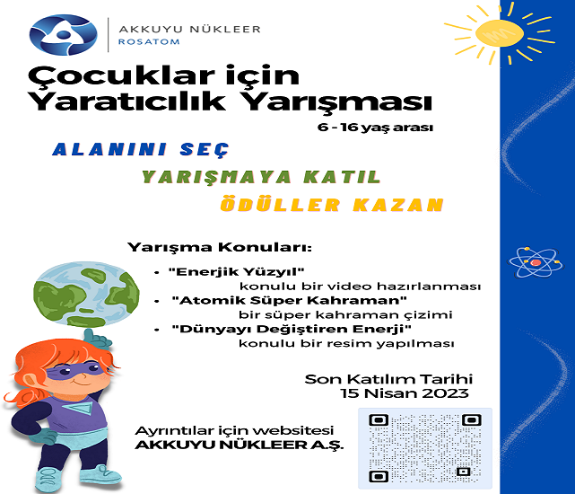 Akkuyu Nükleer A.Ş, 23 Nisan Ulusal Egemenlik ve Çocuk Bayramı dolayısıyla bu yıl da çocuklara yönelik bir yaratıcı yarışma düzenliyor. Yarışmaya Türkiye'nin dört bir yanından 6-16 yaş arasındaki çocuklar ve gençler katılabilecek.