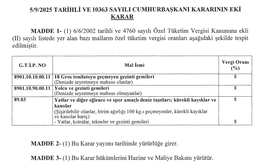 ''4760 sayılı Özel Tüketim Vergisi Kanununa Ekli (II) Sayılı Listede Yer Alan Bazı Malların Özel Tüketim Vergisi Oranlarının Yeniden Tespiti Hakkında Karar (Karar Sayısı: 10363)'' Cumhurbaşknı Kararı, bugünkü Resmi Gazete de yayınlandı (6 Eylül 2025 tarih ve 33009 nolu Resmi Gazete, Cumhurbaşkanı Kararları).