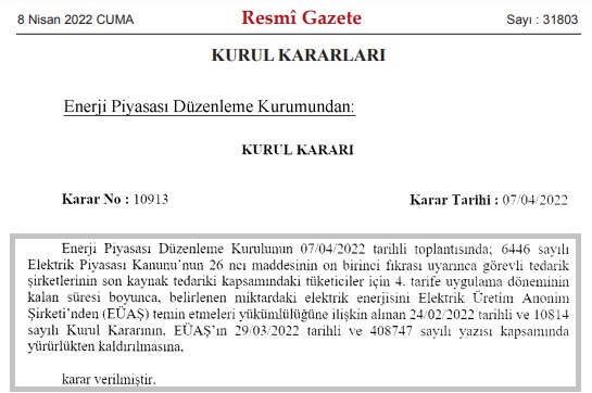 Enerji Piyasası Düzenleme Kurulunun 24.02.2022 tarihli toplantısında; 6446 sayılı Elektrik Piyasası Kanunu'nun 26 ncı maddesinin on birinci fıkrası uyarınca görevli tedarik şirketlerinin, son kaynak tedariki kapsamındaki tüketiciler için 4. tarife uygulama döneminin kalan süresi boyunca temin edeceği elektrik enerjisinin, takvim yılı bazında % 50'sinden az olmamak kaydıyla % 90‘ına kadar olan miktarını Elektrik Üretim Anonim Şirketi'nden temin etmelerine,