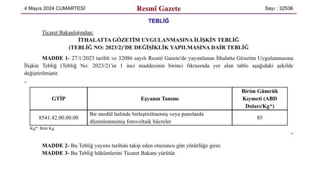 İthalatta Gözetim Uygulanmasına İlişkin Tebliğ (Tebliğ No: 2023/2)’de Değişiklik Yapılmasına Dair Tebliğ” bugünkü Resmi Gazetede, yayınlandı (4 Mayıs 2024 tarihli Resmi Gazete).