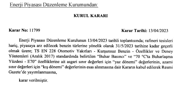 EPDK (Enerji Piyasası Düzenleme Kurumu), 'Akaryakıt yaz-kış dönemi değerleri' konulu Kurul Kararı yayınladı. EPDK Kurul Kararı, bugünkü Resmi Gazedede yayınlandı.