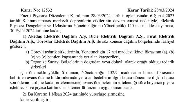 Enerji Piyasası Düzenleme Kurumu (EPDK), ''Akedaş Elektrik Dağıtım - Dicle Elektrik Dağıtım - Fırat Elektrik Dağıtım ve Toroslar Elektrik Dağıtım'' ile ilgili ''Fatura son ödeme tarihi'' konulu önemli bir kurul kararı yayınladı. EPDK Kurul Kararı, bugünkü Resmi Gazete de yayınlandı (29 Mart 2024 tarihli Resmi Gazete).
