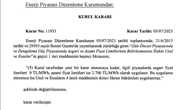 Enerji Piyasası Düzenleme Kurumu (EPDK), gün öncesi piyasaları için asgari ve azami fiyat kararını yayınladı. EPDK kararı, bugünkü Resmi Gazete de yayınlandı (4 Temmuz 2023 tarihli Resmi Gazete).