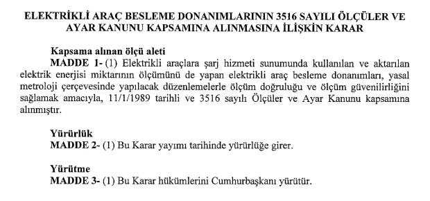 'Elektrikli Araç Besleme Donanımlarının 3516 Sayılı Ölçüler ve Ayar Kanunu Kapsamına Alınmasına İlişkin' Cumhurbaşkanı Kararı, bugünkü Resmi Gazete de yayınlandı (20 Nisan 2022 tarih ve 31815 sayılı Resmi Gazete).