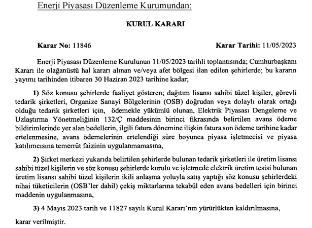 Enerji Piyasası Düzenleme Kurumu (EPDK), ''OHAL Elektrik Piyasaları'' konulu yeni Kurul Kararı yayınladı. EPDK Kurul Kararı, bugünkü Resmi Gazetede yayınlandı (12 Mayıs 2023 tarihli Resmi Gazete).