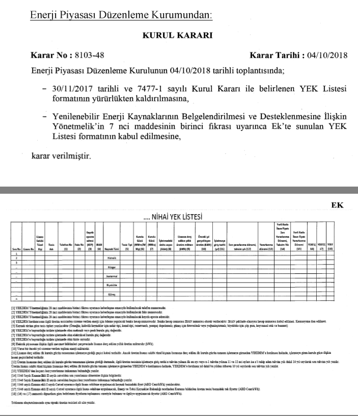 Enerji Piyasası Düzenleme Kurumu (EPDK), Yenilenebilir Enerji Kaynaklarının (YEK) Belgelendirilmesi ve Desteklenmesine İlişkin Yönetmenlik'in 7inci maddesinde değişikliğe gitti.