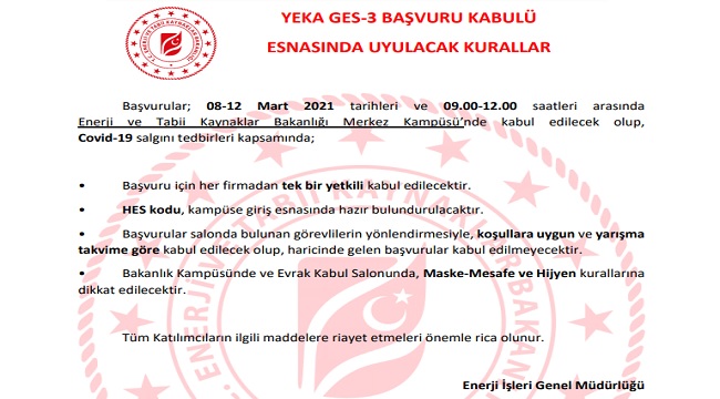 'YEKA GES - 3 Yarışma Başvurusu Esnasında Uygulanacak Kurallar'