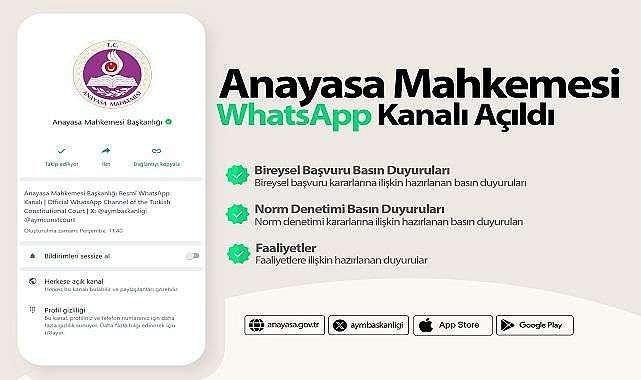 Anayasa Mahkemesi (AYM), bilgi paylaşımı yaptı: ''Anayasa Mahkemesi kararlarına ilişkin basın duyurularının ve Mahkememiz faaliyetlerinin kısa sürede geniş kitlelerin bilgisine sunulması amacıyla kurulan “Anayasa Mahkemesi WhatsApp Kanalı” kullanıma açılmıştır. Aşağıdaki bağlantı üzerinden kanala katılabilirsiniz.''