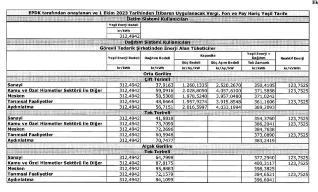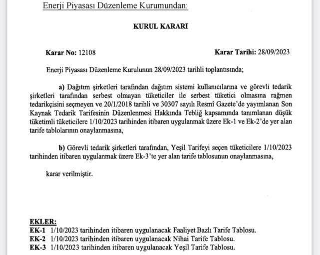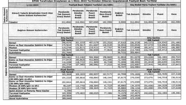 - EPDK'nın onayladığı yeni elektrik tarifeleri, bugünkü Resmi Gazetede yayınlandı (30 Eylül 2023 tarihli Resmi Gazete).