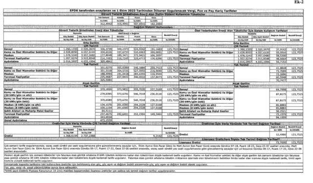 - EPDK (Enerji Piyasası Düzenleme Kurumu), 1 Ekim itibariyle geçerli olacak yeni elektrik birim fiyatlarını açıkladı. Yeni birim fiyatlar 3 aylık dönem için geçerli olacak (1 Ekim - 31 Aralık 2023 dönemi).