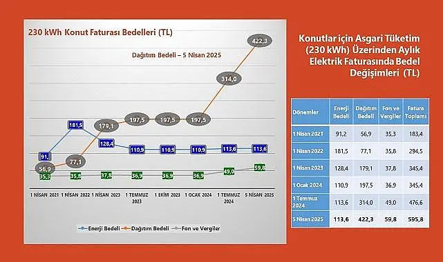 1 Nisan 2021`de 4 kişilik ailenin elektrik asgari faturası 183,4 TL idi. Aradan geçen 4 yıllık dönemin sonunda, 1 Nisan 2025 itibarıyla yüzde 224,8 artışla 595,8 TL`ye yükselmiştir. Değişimin detaylarına bakıldığında, dağıtım bedeli yüzde 642 artarken, enerji bedeli yalnızca yüzde 24,5 artmıştır. Özetle, dağıtım bedelindeki fahiş artış yaşanmasa, dağıtım maliyetlerindeki artış enerji üretim maliyetlerindeki gibi şekillense, fatura toplamına yansıyan artış yüzde 24,5 ile sınırlı kalırdı. Bu durumda, 1 Nisan 2025 itibarıyla aynı tüketime sahip konutlara 595,8 TL yerine 228 TL fatura edilirdi. Aradaki fark, elektrik dağıtım özelleştirmelerinin yurttaşlara yarattığı yükün son 4 yıllık kısmı olarak nitelendirilebilir. Bu rakamlar, enerji üretim maliyetlerinin artmadığı koşullarda bile dağıtım bedeline zam yapıldığını ve özellikle dar gelirli vatandaşlardan dağıtım şirketlerine kaynak aktarıldığını işaret etmektedir.''