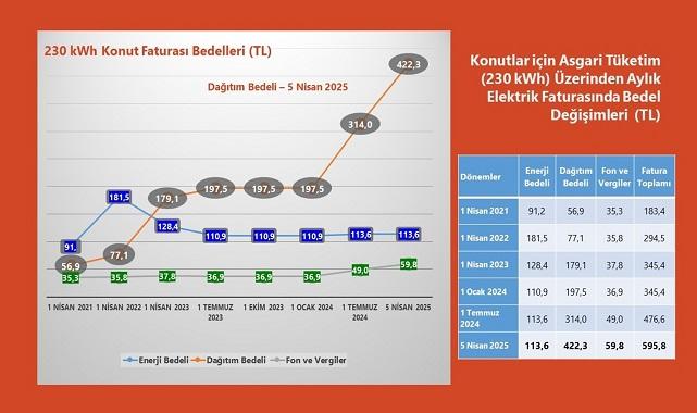 1 Nisan 2021`de 4 kişilik ailenin elektrik asgari faturası 183,4 TL idi. Aradan geçen 4 yıllık dönemin sonunda, 1 Nisan 2025 itibarıyla yüzde 224,8 artışla 595,8 TL`ye yükselmiştir. Değişimin detaylarına bakıldığında, dağıtım bedeli yüzde 642 artarken, enerji bedeli yalnızca yüzde 24,5 artmıştır. Özetle, dağıtım bedelindeki fahiş artış yaşanmasa, dağıtım maliyetlerindeki artış enerji üretim maliyetlerindeki gibi şekillense, fatura toplamına yansıyan artış yüzde 24,5 ile sınırlı kalırdı. Bu durumda, 1 Nisan 2025 itibarıyla aynı tüketime sahip konutlara 595,8 TL yerine 228 TL fatura edilirdi. Aradaki fark, elektrik dağıtım özelleştirmelerinin yurttaşlara yarattığı yükün son 4 yıllık kısmı olarak nitelendirilebilir. Bu rakamlar, enerji üretim maliyetlerinin artmadığı koşullarda bile dağıtım bedeline zam yapıldığını ve özellikle dar gelirli vatandaşlardan dağıtım şirketlerine kaynak aktarıldığını işaret etmektedir.''
