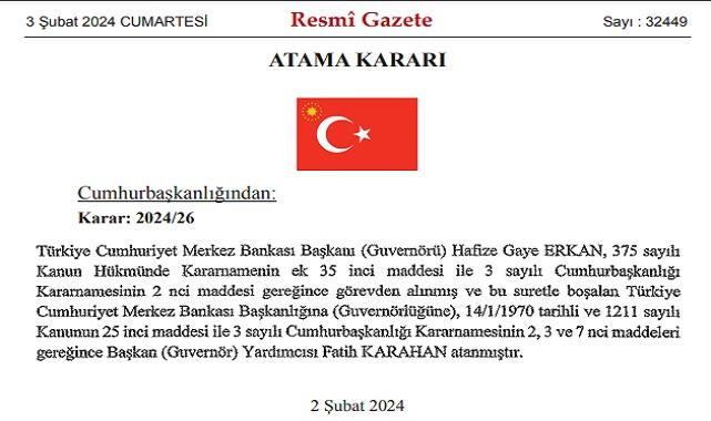 Türkiye Cumhuriyet Merkez Bankası (TCMB) Başkanı Fatih Karahan oldu. Karahan'ın atanmasıyla ilgili Cumhurbaşkanlığı Kararı, bugünkü resmi Gazete de yayınlandı (3 Şubat 2023 tarihli resmi Gazete). Yeni atama kararı, resmi Gazete de yayınlandı.