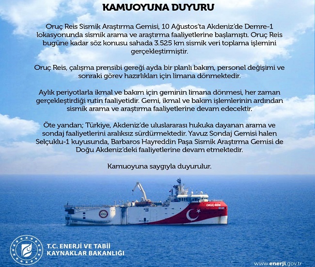 Enerjive Tabi Kaynaklar Bakanlığı (ETKB), 'Oruç Reis Sismik Araştırma Gemisine ilişkin kamuoyu duyurusu' başlığıyla yeni bir duyuru yaptı. Enerji Bakanlığı'nın sosyal medya hesabı üzerinden yaptığı duyuru ayrıntılarını aşağıda okuyabilirsiniz.