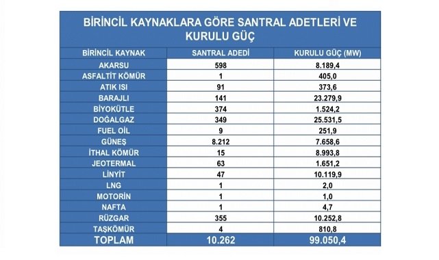 - Türkiye'de elektrik üreten toplam 10.262 adet santral var.