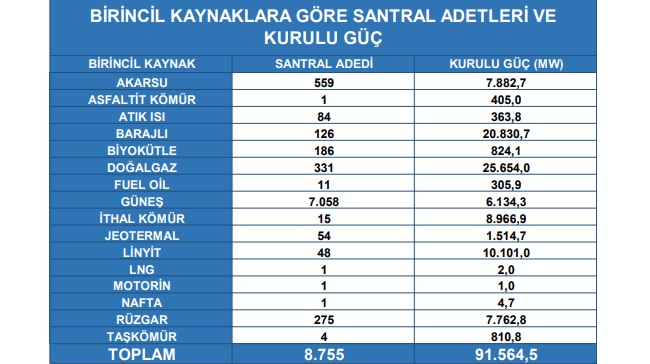 8.755 ELEKTRİK ÜRETEN SANTRAL VAR: Türkiye’de elektrik üreten toplam 8 bin 755 adet santral var (8.755). Bu santrallerin toplam kurulu gücü ise 91 bin 564 megawat (MW). Sayısal adet bakımından en fazla santral Güneş’e ait. Türkiye’de güneş enerjisiyle elektrik üreten toplam 7.058 santral var. Güneş santrallerini 559 adet ile Akarsu Santralleri izliyor (HES). Ve adet bazında en fazla santral üçüncü sırada 331 adet ile doğal gaz santralleri yer aldı.