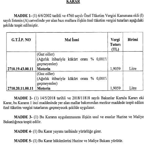 'Bazı Mallara Uygulanacak Özel Tüketim Vergisi Tutarlarının Yeniden Belirlenmesi Hakkında Karar' Cumhurbaşkanı Kararı, bugünkü Resmi Gazetede yayınlandı.