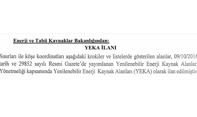Enerji ve Tabii Kaynaklar Bakanlığı (ETKB), yeni YEKA (Yenilenebilir Enerji Kaynak Alanları) ilanı yayınladı. İşte ayrıntılar…