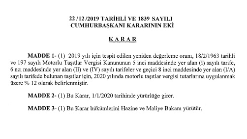 ‘2020 Yılında Motorlu Taşıtlar Vergisi Tutarlarına Uygulanacak Yeniden Değerleme Oranının Belirlenmesine İlişkin Karar’ Resmi GaZetede yayınlandı.