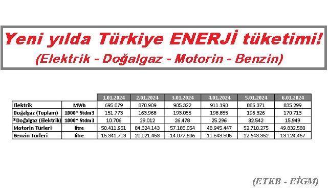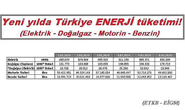 Türkiye günlük toplam enerji tüketimi: Türkiye günlük toplam enerji tüketimi (elektrik, doğalgaz, motorin, benzin) verileri için (1-6 Ocak 2024 günleri) aşağıdak tabloya bakınız.