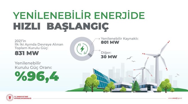 Enerji ve Tabi Kaynaklar Bakanı Fatih Dönmez: 'İlk iki ayda devreye aldığımız 831 MW kurulu gücün yüzde 96,4’ü yenilenebilir enerji kaynaklarından oluştu.'2021 Yılı İlk 2 Ayında Yenilenebilir Enerji!