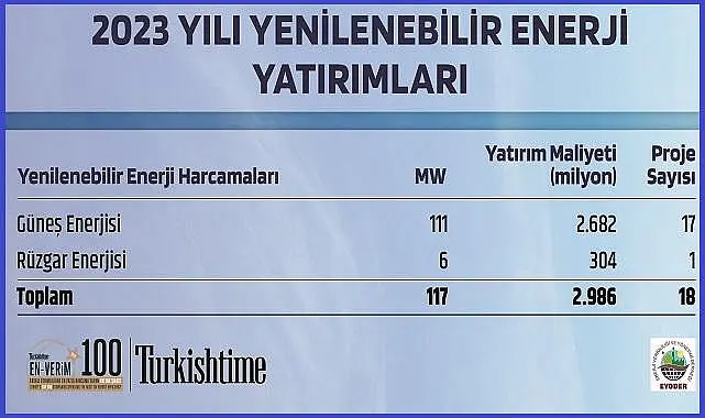 Yenilenebilir enerji yatırımları toplamda 2,98 milyar TL yatırıma karşılık 117 MW kurulu güç sağladı. Güneş enerjisi projeleri bu alanda ağırlık taşırken, rüzgar enerjisi tek bir projeyle yer aldı.
