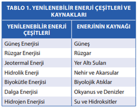 Yenilenebilir enerji kaynakları başlıca “güneş”, “rüzgar”, “jeotermal”, “hidrolik”, “biyokütle”, “dalga”ve “hidrojen” enerjileri olarak gruplandırılmaktadır. Güneşin bu enerji çeşitlerinin büyük bir bölümünün ana kaynağı olduğu ve bunlara dolaylı veya dolaysız etkisinin bulunduğu söylenebilmektedir. Hatta fosil yakıt olarak bilinen kömür, petrol ve doğalgaz da esasında güneş enerjisinin şekil değiştirmiş halleridir. Bu nedenlerden ötürü güneşi dünyanın en önemli enerji kaynağı olarak tanımlayabilmek mümkündür. Aşağıda yenilenebilir enerji çeşitleri ve bunların kaynakları listelenmektedir (Tablo 1).