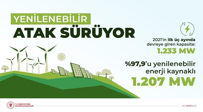 Enerji ve Tabi Kaynaklar Bakanı Fatih Dönmez, konuyla ilgili sosyal medya hesabı üzerinden yeni bilgi paylaşımı yaptı. Enerji Bakanı Dönmez: 'Yenilenebilir enerji atağımız 2021’de de sürüyor. Her geçen gün artan kurulu güç içerisindeki yenilenebilir enerji oranı % 100’ü zorluyor. İlk üç ayda devreye giren kurulu gücümüzün % 97,9’u yenilenebilir enerji kaynaklarından oluştu.'