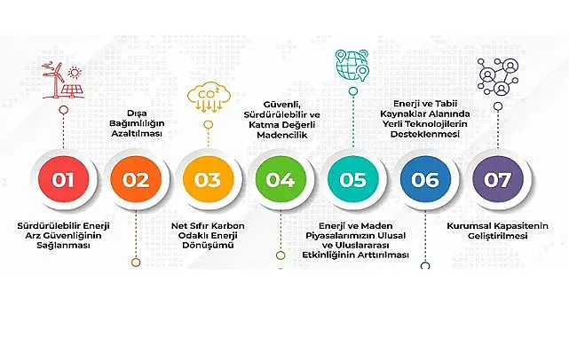 Planda, sürdürülebilir enerji arz güvenliğinin sağlanması, dışa bağımlılığın azaltılması, net sıfır karbon odaklı enerji dönüşümünün yapılması, güvenli, sürdürülebilir ve katma değerli madencilik, enerji ve maden piyasalarının ulusal ve uluslararası etkinliğinin artırılması, enerji ve tabii kaynaklar alanında yerli teknolojilerin desteklenmesi, kurumsal kapasitenin artırılması şeklinde 7 amaç ve 30 hedef belirlendi. Bu amaçlara yönelik hedeflerin detaylı şekilde anlatıldığı planda, sürdürülebilir enerji arz güvenliğinin sağlanması amacıyla elektrikle kurulu gücün artırılacağı, elektrik tüketim ve dağıtım şebekesinin güçlendirileceği, yenilenebilir enerji kapasitesinin artması için şebeke esnekliğinin sağlanacağı, petrol ve gaz altyapısının güçlendirileceği, enerjide uluslararası yatırımlara ilişkin iş birliklerinin artırılacağı kaydedildi.