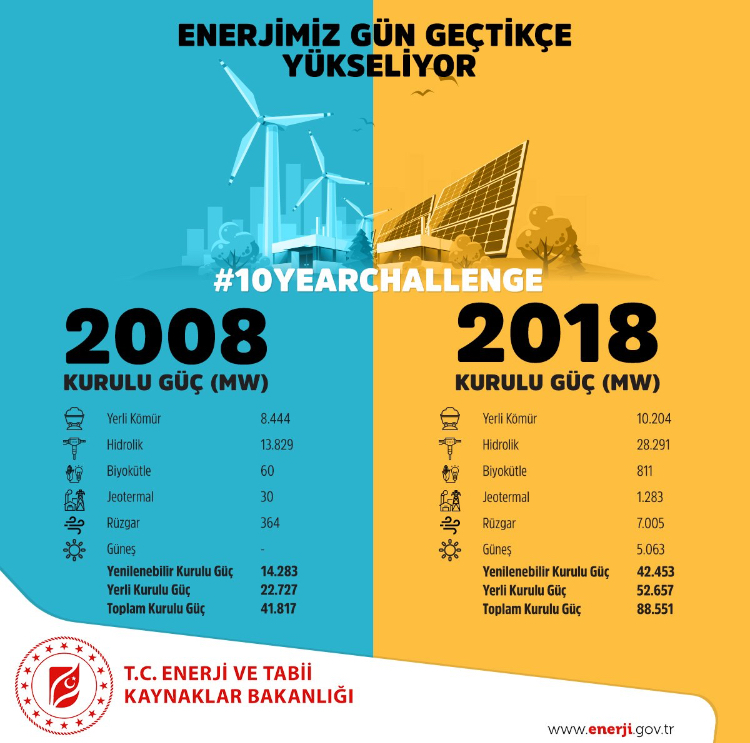 Enerji Bakanlığı sosyal medya üzerinden yaptığı bilgilendirmede Türkiye toplam elektrik enerjisi kurulu gücünün 88 bin 551 megawat (MW) olduğuna dikkat çekti. Bakanlık bu kurulu gücün 52 bin 657 megawatının yerli kaynaklara ait oduğu bilgisine yer verdi. Bakanlık, sosyal medya üzerinden yaptığı bilgilendirmede ‘Daha fazla yerli, daha fazla yenilenebilir’ sloganıyla yerli ve yenilenebilir enerji kaynaklarına vurgu yaptı.
