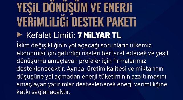 Hazine ve Maliye Dr. Bakanı Nureddin Nebati ''Paket 9 - Yeşil dönüşüm ve enerji verimliliği destek paketi 7 milyar TL'' başlığı ile açıkladığı kredi paketinin ayrıntıları şöyle: Yeşil dönüşüm ve enerji verimliliği destek paketi 7 milyar TL: ''İklim değişikliğinin yol açacağı sorunların ülkemiz ekonomisi için getirdiği riskleri bertaraf edecek ve yeşil dönüşümü amaçlayan projeler için firmalarımız desteklenecektir. Ayrıca, ürteim kalitesi ve miktarının düşüşüne yol açmadan enerji tüketiminin azaltılmasınıamaçlayan yatırımlar desteklenerek enerji verimliliğine katkı sağlayacaktır.''