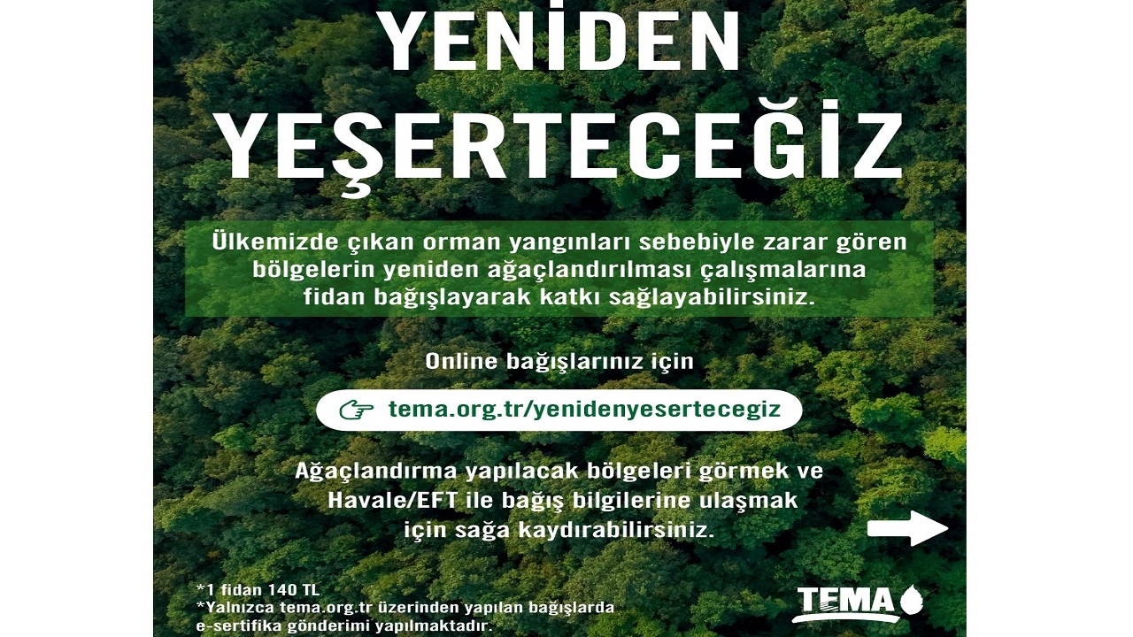 - TEMA Vakfı, yanan ormanları yeniden ağaçlandırmak için yeşil fidan kampanyası başlattı. 1 fidan 40 TL.