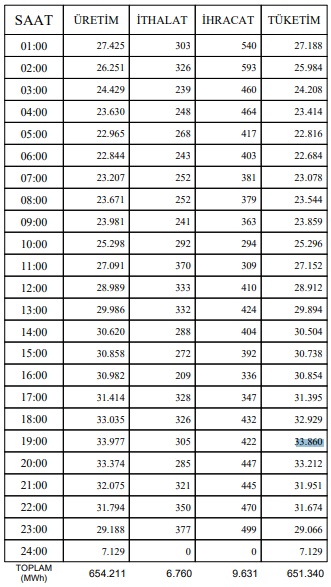 1 OCAK 2019 SALI GÜNÜ ELEKTRİK TÜKETİMİ