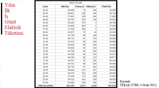 Saat Saat Türkiye Elektrik Tüketimi (4 Ocak 2021 Pazartesi)