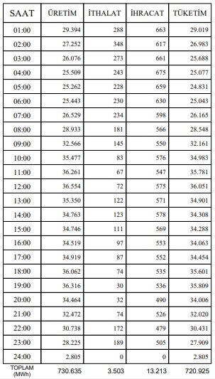 2018 yılının sonu elektrik tüketimi saat gece 00.00 itibariyle 720 milyon 925 bin kwh olarak gerçekleşti. Türkiye Elektrik İletim AŞ (TEİAŞ) Yük Tevzi Bilgi Sistemi (YTBS) son verilerine göre aynı gün üretilen toplam elektriğin kaynak bazında yüzde 22'si doğalgazla çalışan santrallerde üretildi. HES'lerde (Hidroelektrik Santralleri) ise toplam üretimin yüzde 25' gerçekleşti. Bu rakamın yüzde 18'i barajlı HES'lerde, geri kalan yüzde 7'si ise Akarsu HES'lerde üretildi. Yılın son gününde ithal kömürün elektrik üretimindeki payı yüzde 25 oran ile HES'lerle aynı oldu. Geri kalan üretim ise yerli kömür, rüzrgar, güneş, jeotermal ve diğer kaynaklardan elde edildi.