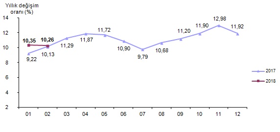 Türkiye İstatistik Kurumu (TUİK), şubat ayı fiyat artışlarını açıkladı. 2018 yılı Şubat ayında bir önceki aya göre yüzde 0,73, bir önceki yılın Aralık ayına göre yüzde 1,76, bir önceki yılın aynı ayına göre yüzde 10,26 ve on iki aylık ortalamalara göre yüzde 11,23 artış gerçekleşti.