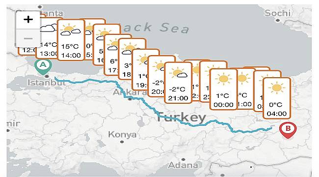 - Evet sürücüler; güvenli bir seyahat için yola ya da trafiğe çıkmadan Meteoroloji Genel Müdürlüğü (MGM)'nin Karayolları Hava Tahmin Sistemi’ne giriyor, yol çıkış ve varış noktasını yazıyorsunuz. Yol hava durumu önünüzde.