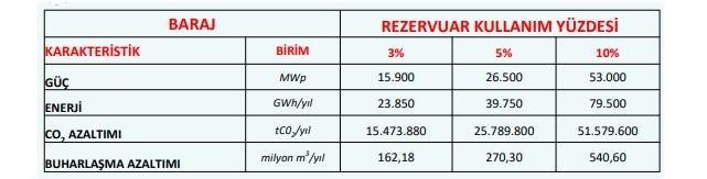 Öte yandan, yüzer geslerin yüzde 10'luk baraj gölü yüzey alanı kullanımı neticesinde, doğaya salınacak karbondioksitten de 51 milyon tonun üzerinden azaltım sağlayacağı öngörülüyor.